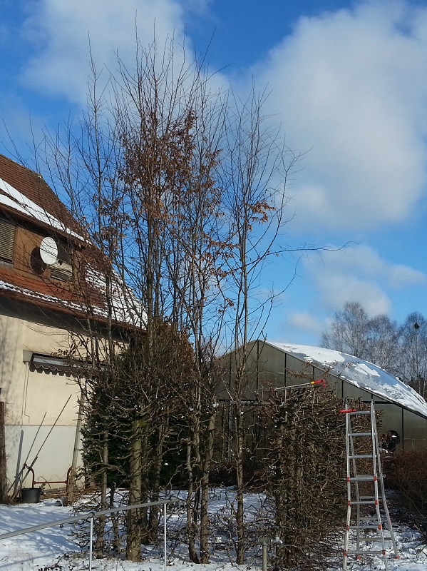 Die Bilder zeigen eine Hainbuchen-Hecke im Winter vor und während des Schnittes, und im Sommer 6 Monate später vor und nach dem normalen Sommerschnitt.